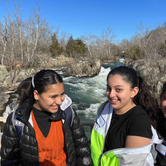 Counterclockwise from top left: Volunteer Steve and 7th grader Vaughn pause as Vaughn crosses a small creek. 7th graders Madina, Sama, and Sama share a laugh near Great Falls. 7th grader Juan says "Peace Out." Douha, Parvin and Sama take in the river up close under perfect blue skies. Lunch with a view for Carlos and friends; Sama and her classmate work their way up a rock-strewn path. Michael pauses for a photo in what looks like a very perilous situation (it wasn't!); Douha and sister Douaa share their smiles. (Click photos to expand)